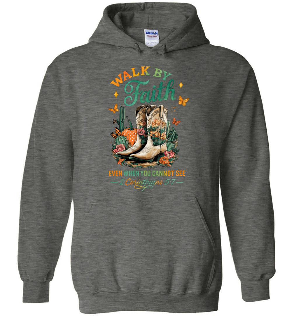 Christian Fall Hoodie Walk By Faith Cowgirl Boot Design dark heather