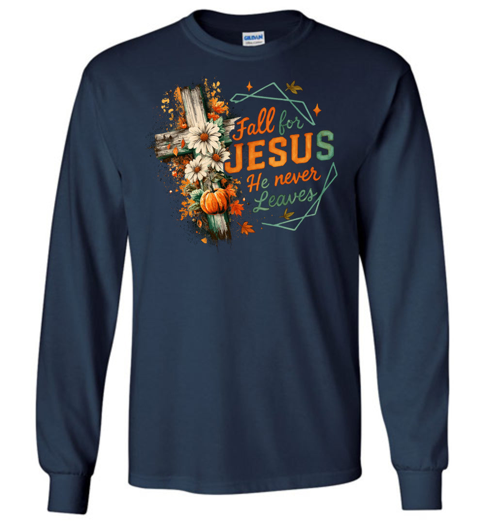 Christian Fall LS T-Shirt Fall For Jesus He Never Leaves