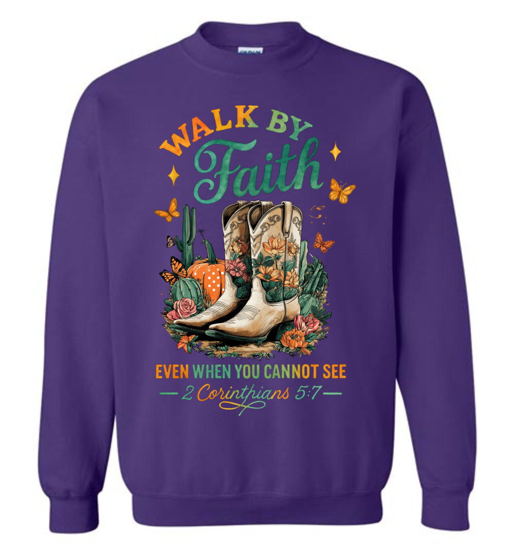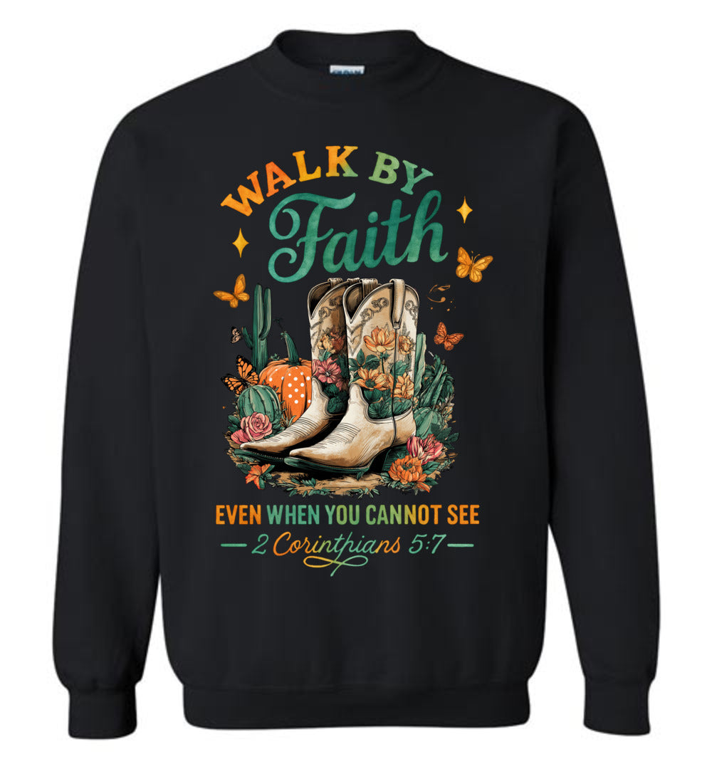 13KGHT73 Christian Fall Sweatshirt Walk By Faith Cowgirl Boot Design – That's A Cool Tee