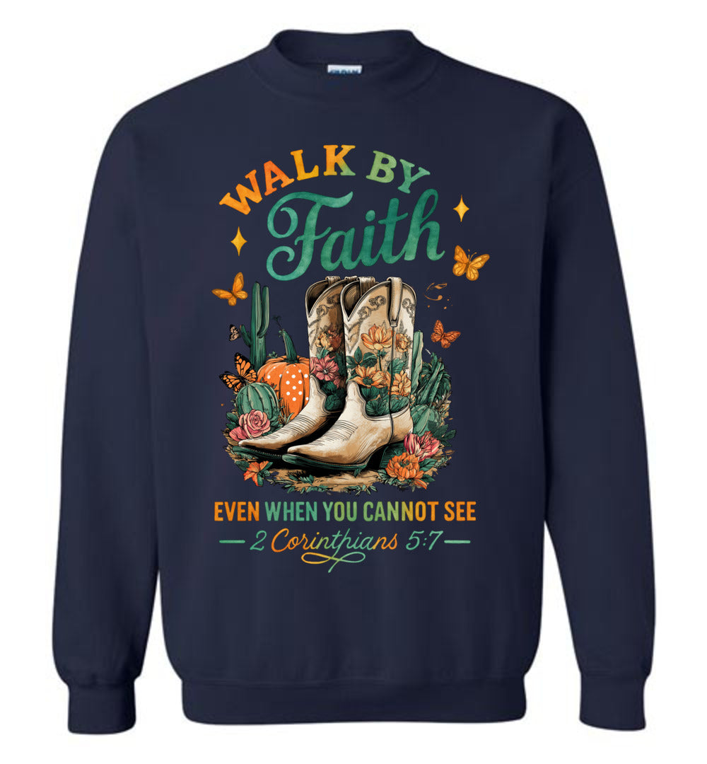 Christian Fall Sweatshirt Walk By Faith Cowgirl Boot Design navy