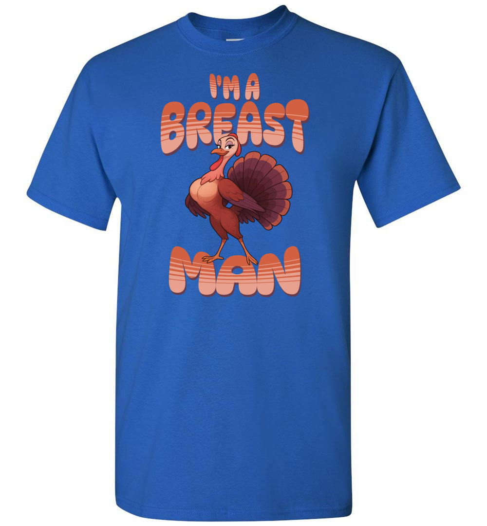 Navy blue t-shirt with a graphic of a turkey and text 'I'm a BREAST MAN' on a white background