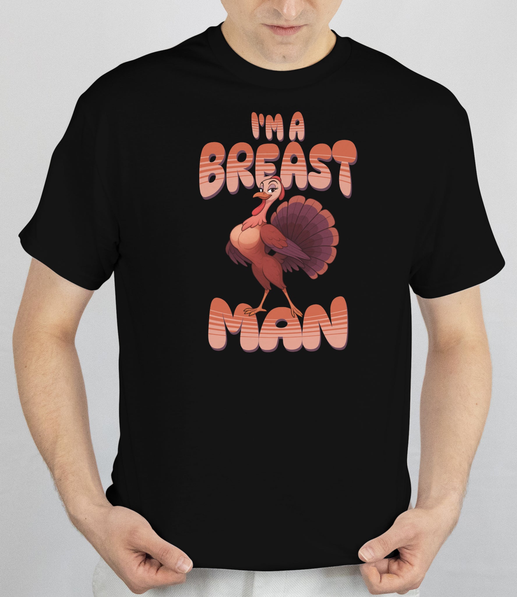 Black t-shirt with a graphic of a turkey and text 'I'm a BREAST MAN' on a white background