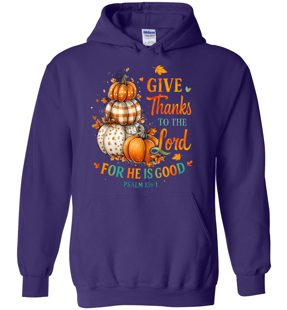 Christian Fall Hoodie Give Thanks To The Lord Psalm 136.1 purple