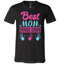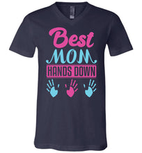 Best Mom Hands Down Mom T Shirt. A nice treat or the perfect gift idea for mom! Available in crew or v-neck in several colors on the premium unisex bella canvas t-shirt. Want to customize it? You replace "mom" with a different name and even add the kids names to it! Just use the drop-down menus to add your customization.