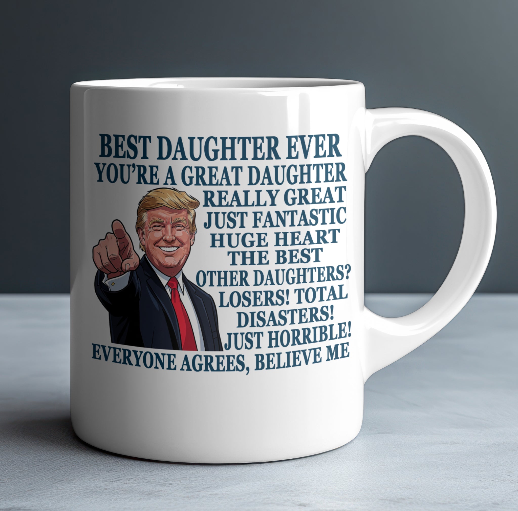 Funny Daughter Trump 11oz White Mug featuring Donald Trump pointing directly at you with an hilarious tribute that reads, "Best Daughter Ever. You're a great daughter. really great. just fantastic, huge heart, the best. Other Daughters? Losers! Total Disasters! Just Horrible! Everyone Agrees, Believe me." This playful mug captures the unmistakable speaking style of the greatest president ever in a lighthearted way that's perfect for daughters with a sense of humor. Crafted from high-quality white gloss ceramic, this 11oz mug is built to last through daily use. The durable AAA ORCA Coating™ technology ensures your design stays vibrant and sharp, resisting fading even after countless washes. Both dishwasher and microwave safe, it's convenient for everyday enjoyment—whether you're sipping your morning coffee or reheating your afternoon beverage. Make your daughter smile with a gift that combines humor, quality craftsmanship, and a bold political twist. It's the kind of mug that sparks conversations and laughs around the office or at home.
