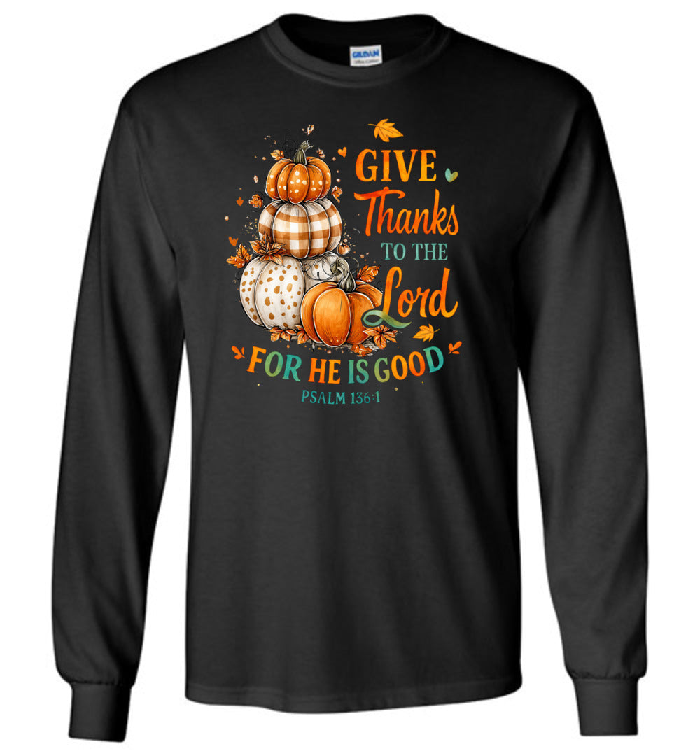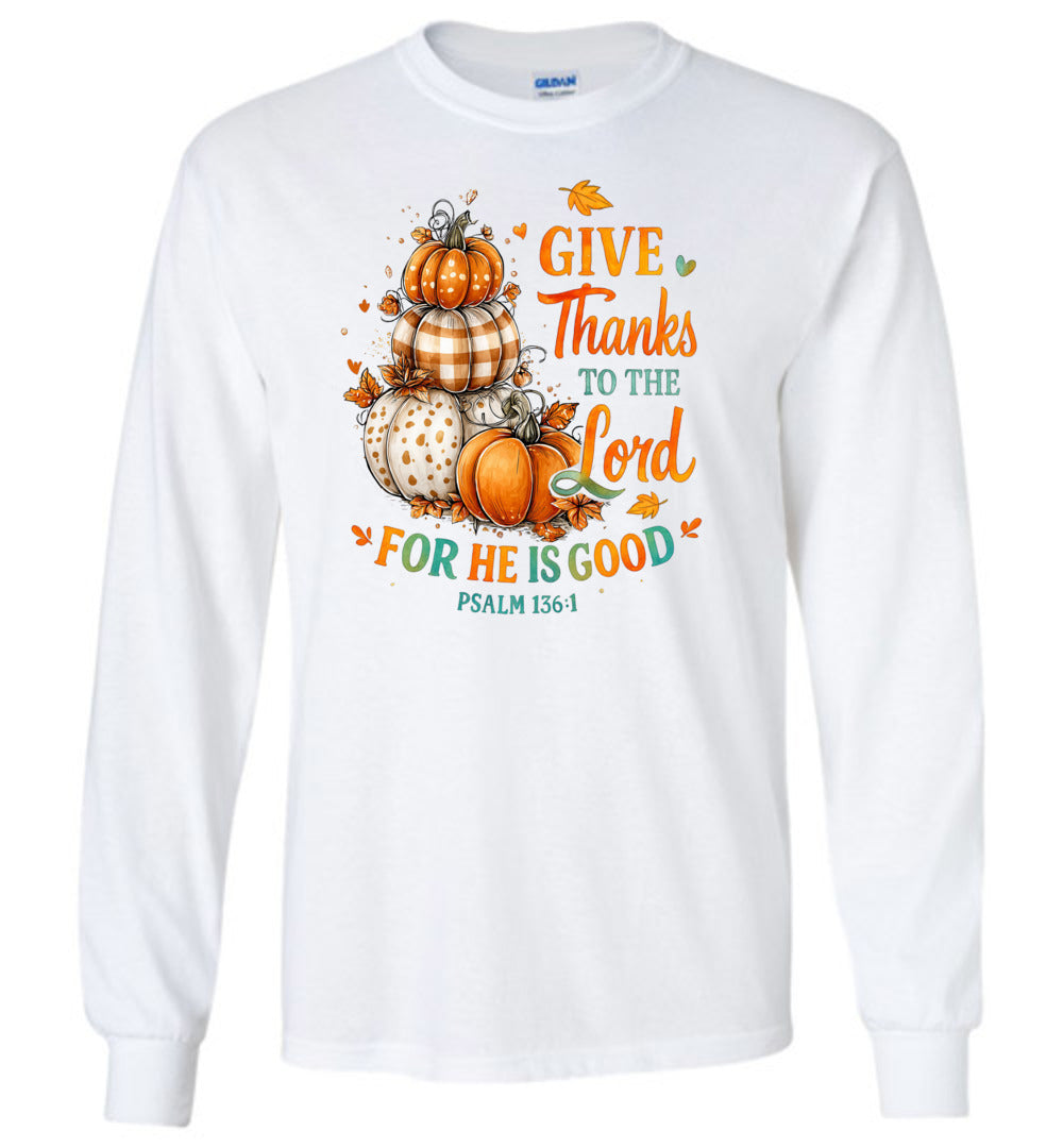 Christian Fall LS Tshirt Give Thanks To The Lord Psalm 136.1