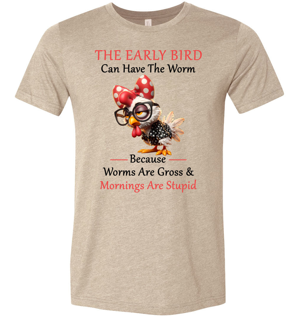 Gray t-shirt with a cartoon chicken wearing glasses and a bow, text 'The early bird can have the worm because worms are gross and mornings are stupid' on a white background.