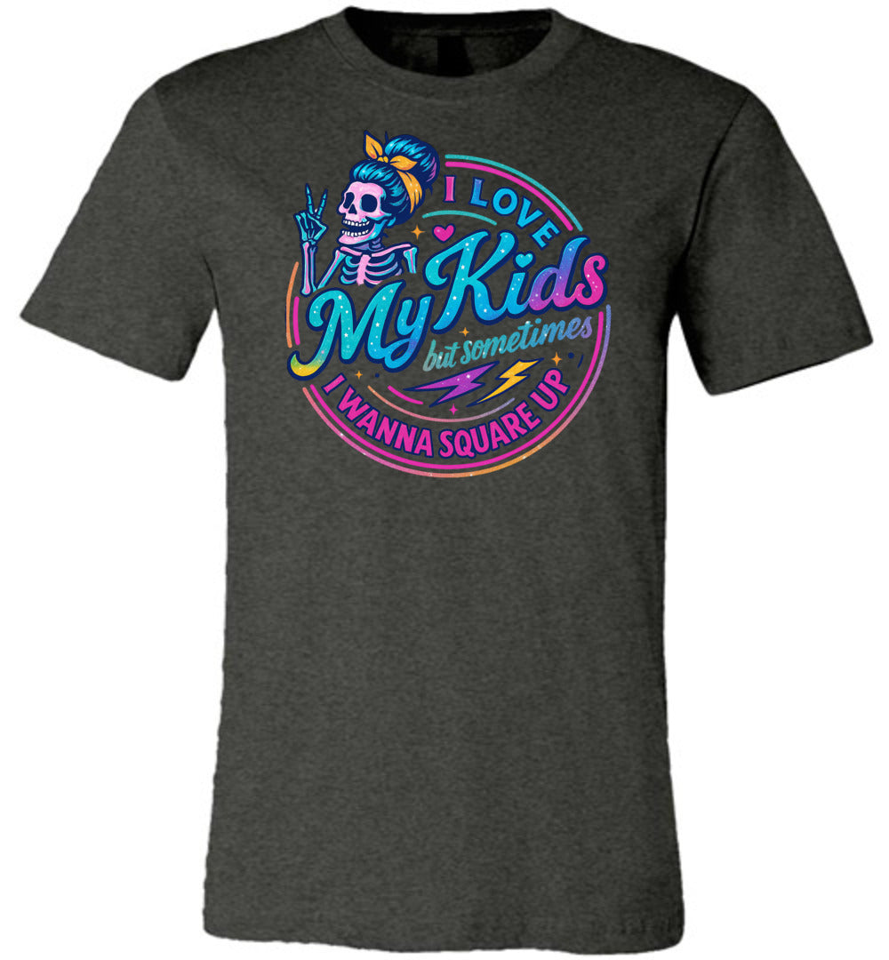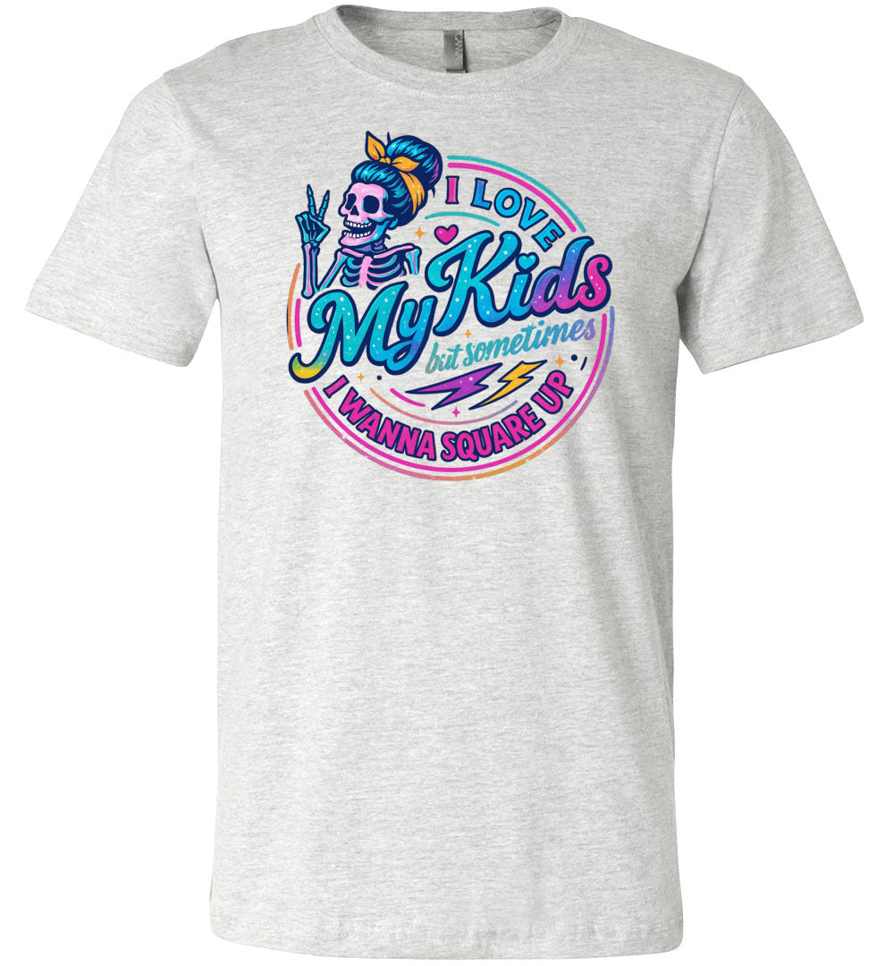 Funny Quote Shirt: I Love My Kids But Sometimes I Wanna Square Up. This playful tee features a vibrant, eye-catching skeleton character design that brings humor and personality to your everyday wardrobe. Perfect for parents who appreciate a good laugh, this unisex shirt combines comfort with comedy in a way that sparks conversations and smiles. Crafted from premium Bella Canvas fabric, this tee delivers exceptional softness and durability. The 100% combed ring-spun cotton jersey (with Athletic Heather at 90% cotton/10% polyester blend) feels luxurious against your skin while maintaining its shape wash after wash. The modern, slightly fitted silhouette flatters most body types without sacrificing comfort. Available in five versatile colors to match your style, this shirt works equally well as a casual everyday piece or a conversation starter at social gatherings. Whether you're a parent, gift-giver, or humor enthusiast, this funny quote tee delivers quality, comfort, and personality in one wearable package. Lightweight at just 4.2 oz, it's ideal for layering or wearing solo year-round.